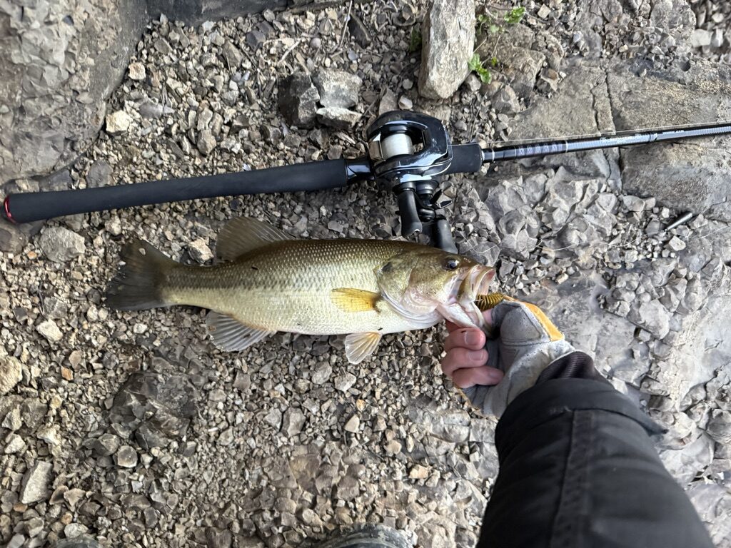 12月。減水リザーバーの冷え込みで沖に出てしまったバスを遠投で釣りました。