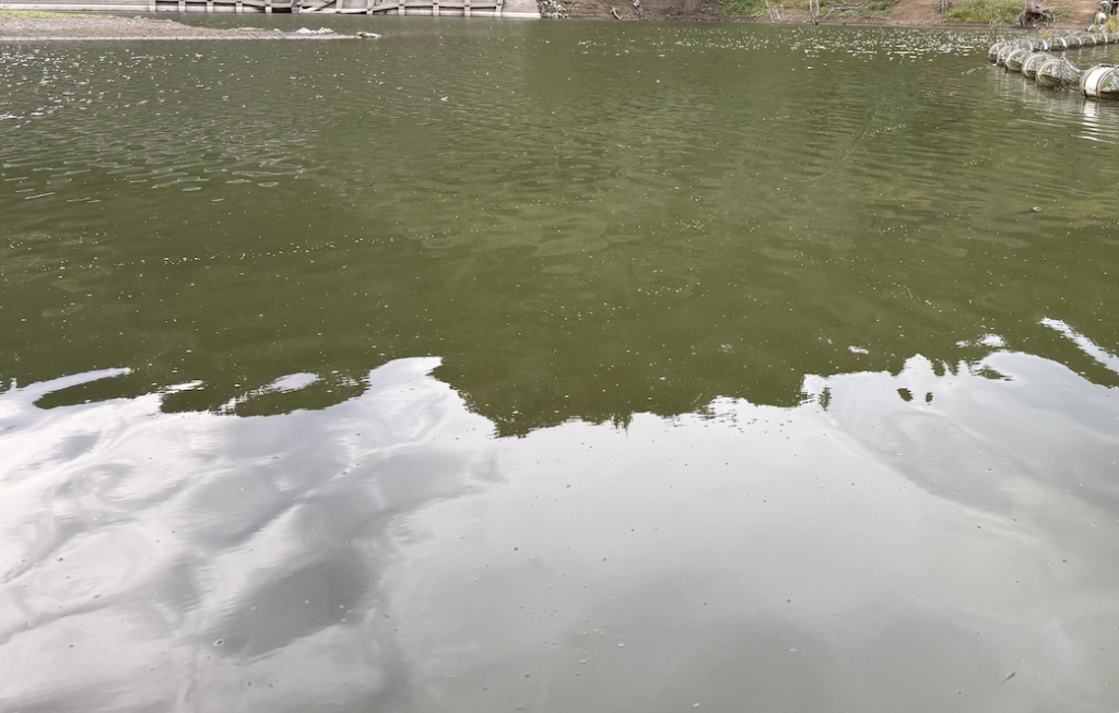 減水は相変わらずの状況、気温が落ちてるからか、減水して少ない水が変化しやすいのか、朝はアオコっぽい緑の膜と小さな泡でガビガビな表層で、水質がいかにも悪そうな水の色。上の写真は水質が落ち着いた午後の様子です。それでもなんかこう泡っぽい感じ。ボイルも少ないです。