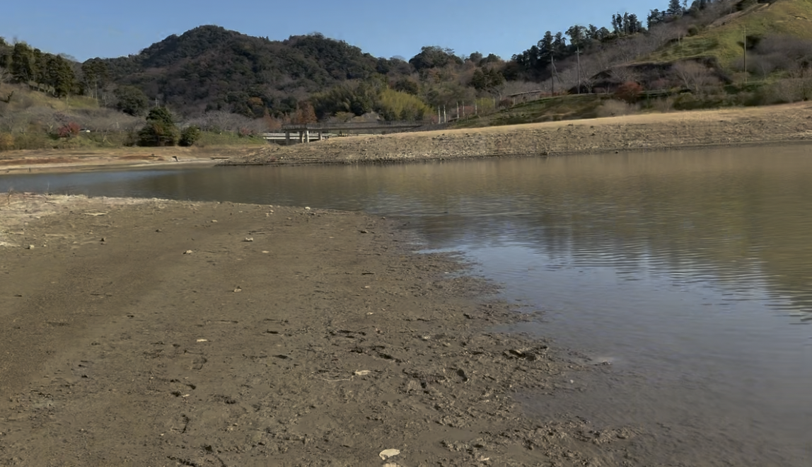 さて、このリザーバーはとても狭いです。減水しているからより水域は絞られます。大半が水深50cm以下まで減水(長靴で余裕で入っていけます)。ほぼシャロー。ブレイクとかディープはもうほぼ消滅しています。