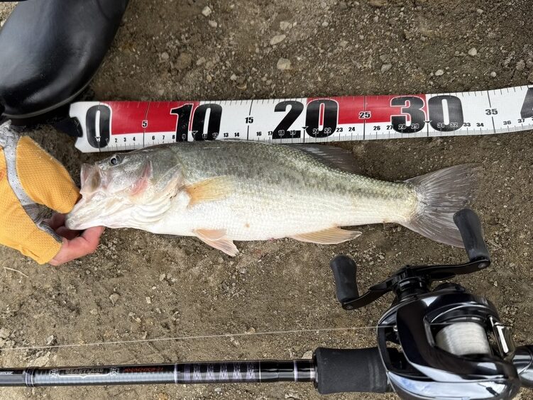 そして2時前、ドシャローの立木を攻めていたササタケ君が25cmをゲット!スプリットショットのズル引き出そう。
