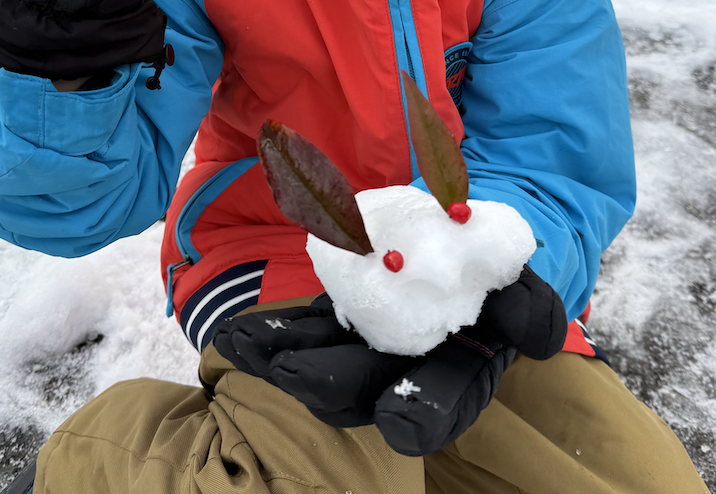 姪っ子が雪でうさぎ作ってました。