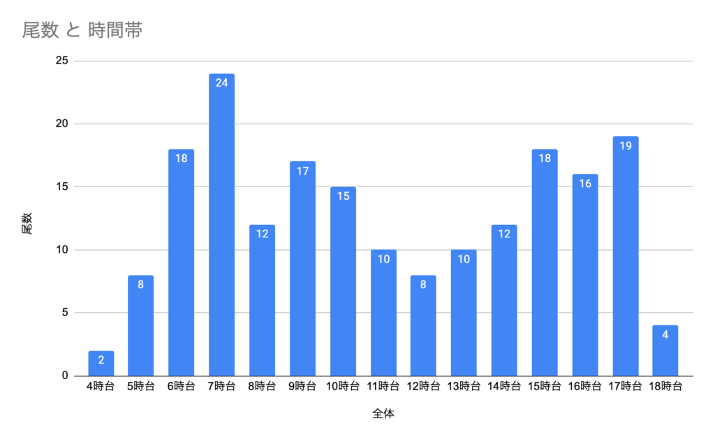 ハイシーズンは日の出から日没までやり切る日が多かったです。しかし、真夏などは体力の消耗が激しいので、13時から2時間程度休憩を取ることが多くありました。ですので13時〜14時台は釣行分母は少ない傾向です。あとは春先や冬の寒い日は朝やらないので、分母が減ります。
